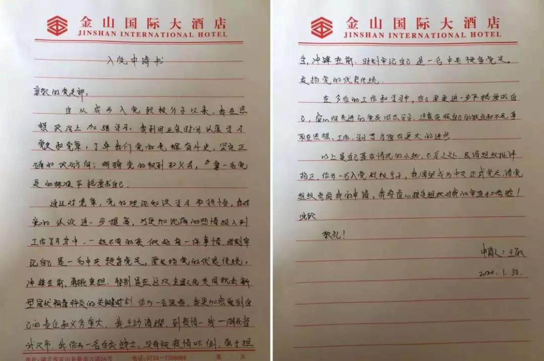 1月30日,在(zai)武漢(han)(han)戰“疫”第一線(xian),短(duan)短(duan)的(de)(de)(de)(de)(de)兩天(tian),讓青年(nian)護士王敏、王曉霞最(zui)驚(jing)訝、最(zui)感動的(de)(de)(de)(de)(de)就是(shi)防(fang)控(kong)疫情黨員(yuan)先行(xing),最(zui)危急(ji)的(de)(de)(de)(de)(de)關頭、最(zui)危險的(de)(de)(de)(de)(de)地方總有共(gong)產黨員(yuan)沖在(zai)前面(mian),“我(wo)(wo)是(shi)黨員(yuan)我(wo)(wo)先上”成為(wei)最(zui)響亮的(de)(de)(de)(de)(de)口號(hao)。到達武漢(han)(han)的(de)(de)(de)(de)(de)第二天(tian),她們就向內蒙(meng)古(gu)衛健委成立的(de)(de)(de)(de)(de)援助武漢(han)(han)臨時黨支(zhi)部遞交了入黨申請書。她們表示,要在(zai)武漢(han)(han)防(fang)疫一線(xian)努力工作,向黨員(yuan)同志學習、看齊,以實際行(xing)動早日成為(wei)一名正式的(de)(de)(de)(de)(de)共(gong)產黨員(yuan)!