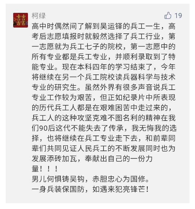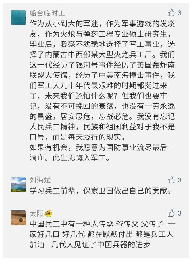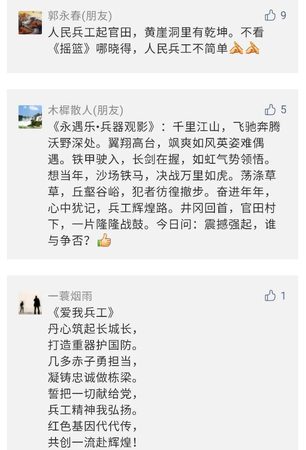 觀眾在兵器工業集團官微的留言區直抒了觀影感受,有的熱淚盈眶,有的心潮起伏,有的興起賦詩,有的認為讓心靈得到凈化、思想得以提升,有的認為是最直觀的國防教育教材......