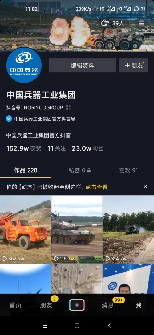 近日 中國(guo)兵器工業集團(tuan)抖音(yin)號 喜獲殊榮 成為(wei)2020年政(zheng)務(wu)抖(dou)音號(hao) 優秀創作者 2020年1月 集團公司抖音號正式開(kai)通 近(jin)1年(nian)來,短(duan)視頻宣傳取得良好效果 截至目前,共發(fa)布視頻228個 總粉(fen)絲數23萬(wan)(wan),獲贊152萬(wan)(wan) 播放總量已超(chao)8000萬 |