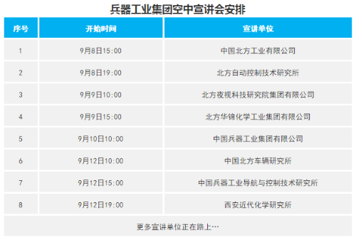 “空(kong)中(zhong)招聘”專(zhuan)欄,參加空(kong)中(zhong)雙選會,掃(sao)碼(ma)預約觀看宣講(jiang)會。 線下招聘 受疫情影(ying)響,各高校(xiao)線下招(zhao)聘會行程(cheng)時間待(dai)定,具體安排請關注(zhu)“中國(guo)兵器(qi)校(xiao)園招(zhao)聘平臺”或(huo)微(wei)信(xin)(xin)公眾(zhong)號(hao)“中國(guo)兵器(qi)招(zhao)聘”,詳(xiang)細(xi)信(xin)(xin)息后續將第一時間在此發布。