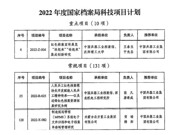 為(wei)深入(ru)貫徹落實《“十四五”全國檔案(an)事業發展規劃(hua)》要求,著(zhu)力(li)提升檔案(an)科(ke)(ke)研自主創(chuang)新(xin)能力(li),根據《國家檔案(an)局辦公室關于開展2022年度(du)國家檔案(an)局科(ke)(ke)技(ji)(ji)項(xiang)目(mu)立(li)項(xiang)工作的(de)通(tong)知》要求,中(zhong)國兵器工業集(ji)團檔案(an)館(以下簡稱檔案(an)館)依據《2022年科(ke)(ke)技(ji)(ji)項(xiang)目(mu)立(li)項(xiang)選題(ti)指南》,組織各單位(wei)申報(bao)成功三個(ge)檔案(an)科(ke)(ke)技(ji)(ji)項(xiang)目(mu)在國家檔案(an)局立(li)項(xiang),其中(zhong)一(yi)個(ge)項(xiang)目(mu)為(wei)國家級(ji)10項(xiang)重點項(xiang)目(mu)之一(yi),排名(ming)第(di)六,這是(shi)繼2021年在國家檔案(an)局首次立(li)項(xiang)三個(ge)項(xiang)目(mu)后的(de)又一(yi)重大突(tu)破,標(biao)志著(zhu)兵器工業檔案(an)科(ke)(ke)研工作邁上新(xin)臺階。