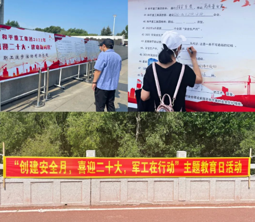 和(he)平重工(gong)集團在安(an)全生(sheng)產月(yue)期間(jian)組織開展了(le)“創(chuang)建(jian)安(an)全月(yue) 喜迎二十大 軍工(gong)在行(xing)動”主題教育日(ri)活動,現場懸掛宣(xuan)(xuan)(xuan)傳橫幅標(biao)語,工(gong)作人員為職(zhi)工(gong)們發放安(an)全知識宣(xuan)(xuan)(xuan)傳冊、扇(shan)子(zi)等宣(xuan)(xuan)(xuan)傳用品,并在現場組織了(le)安(an)全知識有(you)獎答題環(huan)節,調動廣(guang)大職(zhi)工(gong)參與的積極性(xing),大力營(ying)造了(le)“關愛生(sheng)命、關注安(an)全”的良好氛圍。