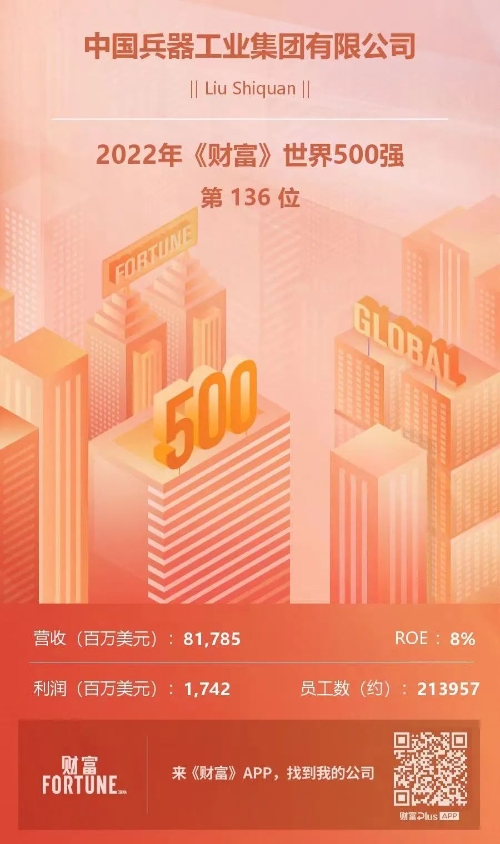 8月3日,《財富》世界500強排行(xing)榜正式(shi)發布(bu),中國兵器工業集團(tuan)有限公(gong)司以817.85億美元(yuan)的營業收入排名第136位,連續(xu)第13年入榜。
