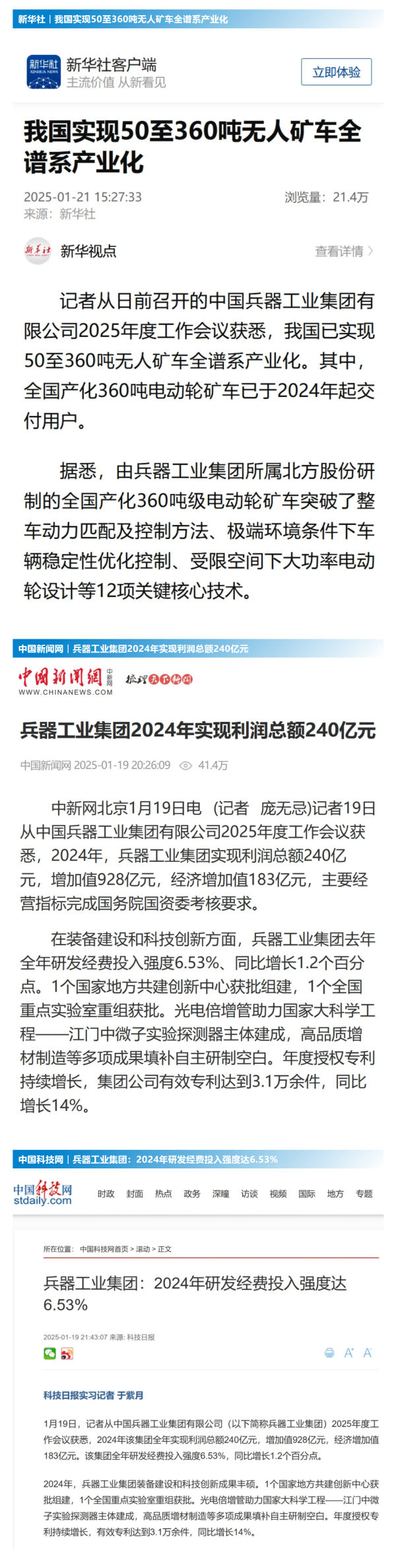 1月19日(ri)至20日(ri),中(zhong)國兵(bing)器工(gong)(gong)業集(ji)團有限公司(si)2025年(nian)度(du)工(gong)(gong)作(zuo)會(hui)議(yi)在京召開,會(hui)議(yi)總(zong)結2024年(nian)工(gong)(gong)作(zuo),分(fen)析形勢任務,明確工(gong)(gong)作(zuo)思路,部署(shu)2025年(nian)工(gong)(gong)作(zuo)。 集團(tuan)公(gong)(gong)(gong)司(si)2024年(nian)取(qu)得的(de)(de)成績及(ji)下一步(bu)重點工作(zuo)(zuo)受到社會媒(mei)體(ti)(ti)(ti)(ti)廣泛關(guan)注(zhu)。新(xin)(xin)(xin)華(hua)社、中(zhong)(zhong)國(guo)(guo)(guo)新(xin)(xin)(xin)聞網(wang)(wang)(wang)、中(zhong)(zhong)國(guo)(guo)(guo)科(ke)(ke)技(ji)網(wang)(wang)(wang)、光(guang)明(ming)(ming)日(ri)報(bao)(bao)(bao)客(ke)(ke)戶(hu)(hu)端、經(jing)濟日(ri)報(bao)(bao)(bao)客(ke)(ke)戶(hu)(hu)端、中(zhong)(zhong)國(guo)(guo)(guo)日(ri)報(bao)(bao)(bao)網(wang)(wang)(wang)、國(guo)(guo)(guo)務院國(guo)(guo)(guo)資委網(wang)(wang)(wang)站、學(xue)習強國(guo)(guo)(guo)中(zhong)(zhong)央企業(ye)學(xue)習平(ping)臺(tai)、新(xin)(xin)(xin)浪網(wang)(wang)(wang)、網(wang)(wang)(wang)易網(wang)(wang)(wang)、搜狐網(wang)(wang)(wang)、騰(teng)訊網(wang)(wang)(wang)、鳳凰網(wang)(wang)(wang)等(deng)中(zhong)(zhong)央主流(liu)媒(mei)體(ti)(ti)(ti)(ti)、國(guo)(guo)(guo)家(jia)部委網(wang)(wang)(wang)站及(ji)知名(ming)網(wang)(wang)(wang)絡媒(mei)體(ti)(ti)(ti)(ti)對集團(tuan)公(gong)(gong)(gong)司(si)2025年(nian)度工作(zuo)(zuo)會議進(jin)行(xing)了(le)(le)報(bao)(bao)(bao)道,重點關(guan)注(zhu)集團(tuan)公(gong)(gong)(gong)司(si)經(jing)營(ying)業(ye)績、科(ke)(ke)技(ji)創新(xin)(xin)(xin)、產業(ye)結(jie)構布(bu)(bu)局優化等(deng)情況。其中(zhong)(zhong),新(xin)(xin)(xin)華(hua)社以《我(wo)國(guo)(guo)(guo)實現50至360噸無(wu)人(ren)礦車全譜系產業(ye)化》為題,重點報(bao)(bao)(bao)道了(le)(le)集團(tuan)公(gong)(gong)(gong)司(si)在推動智能制造水平(ping)提升方面取(qu)得的(de)(de)成效(xiao);中(zhong)(zhong)國(guo)(guo)(guo)新(xin)(xin)(xin)聞網(wang)(wang)(wang)、光(guang)明(ming)(ming)日(ri)報(bao)(bao)(bao)客(ke)(ke)戶(hu)(hu)端、經(jing)濟日(ri)報(bao)(bao)(bao)客(ke)(ke)戶(hu)(hu)端、中(zhong)(zhong)國(guo)(guo)(guo)日(ri)報(bao)(bao)(bao)網(wang)(wang)(wang)等(deng)就集團(tuan)公(gong)(gong)(gong)司(si)2024年(nian)度經(jing)營(ying)業(ye)績及(ji)各項工作(zuo)(zuo)取(qu)得的(de)(de)成果(guo)進(jin)行(xing)報(bao)(bao)(bao)道;中(zhong)(zhong)國(guo)(guo)(guo)科(ke)(ke)技(ji)網(wang)(wang)(wang)著重報(bao)(bao)(bao)道了(le)(le)集團(tuan)公(gong)(gong)(gong)司(si)在科(ke)(ke)技(ji)創新(xin)(xin)(xin)和(he)優化產業(ye)結(jie)構布(bu)(bu)局方面的(de)(de)最新(xin)(xin)(xin)進(jin)展(zhan)。集團(tuan)公(gong)(gong)(gong)司(si)門戶(hu)(hu)網(wang)(wang)(wang)站、微(wei)信公(gong)(gong)(gong)眾號、微(wei)博等(deng)新(xin)(xin)(xin)媒(mei)體(ti)(ti)(ti)(ti)平(ping)臺(tai)以及(ji)《中(zhong)(zhong)國(guo)(guo)(guo)兵工報(bao)(bao)(bao)》也對集團(tuan)公(gong)(gong)(gong)司(si)工作(zuo)(zuo)會議進(jin)行(xing)了(le)(le)及(ji)時報(bao)(bao)(bao)道,各成員(yuan)單位紛紛對相關(guan)內容進(jin)行(xing)轉載,引(yin)發全系統關(guan)注(zhu)。 集團公司職工及廣大網友熱議工作會 “2025年工作會為我們指(zhi)明了發展方向、明確(que)了奮斗目標,面(mian)對全新的機(ji)遇和(he)挑戰(zhan),作為兵工人深感(gan)責(ze)任(ren)重大(da)。” “科技是(shi)第一生產力(li),一定要以科技創新(xin)引(yin)領新(xin)質生產力(li)發(fa)展,為高(gao)質量發(fa)展提供支撐。” “把各項工作做深、做實、做細,努力為集團公司高質量發(fa)展添(tian)磚加(jia)瓦。” “2024年(nian)中國(guo)兵器展示了大國(guo)重器,祝新的一(yi)年(nian)中再創(chuang)輝煌!” |