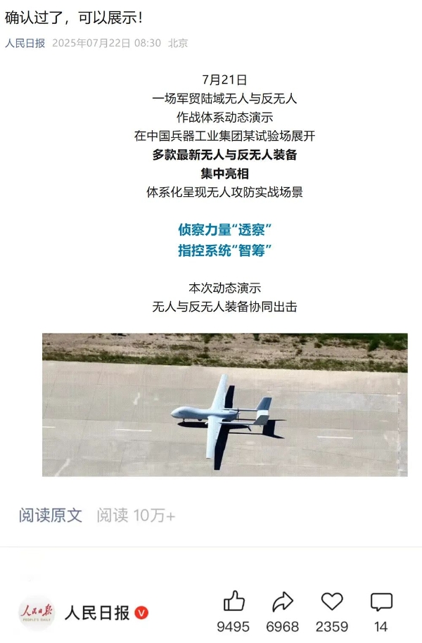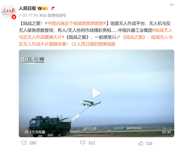 7月(yue)21日(ri),中(zhong)(zhong)國兵(bing)器工業集團有限公司在位于內蒙古的某試(shi)驗場(chang)舉辦軍(jun)貿(mao)陸域無(wu)(wu)人與反無(wu)(wu)人作戰體系主(zhu)題日(ri)活動,攜(xie)無(wu)(wu)人機、巡(xun)飛彈、反無(wu)(wu)人機等最新武(wu)器裝備登場(chang)亮相(xiang),展現了一場(chang)無(wu)(wu)人與反無(wu)(wu)人領域激烈對抗的實戰場(chang)景(jing)。中(zhong)(zhong)央主(zhu)流媒(mei)體、地方媒(mei)體、知名網絡媒(mei)體,以及(ji)集團公司各宣傳平臺紛紛進行報道,多(duo)次登上熱搜,引發廣泛關注。 央視新聞頻道(dao)《新聞直(zhi)播間》《東方時(shi)(shi)空》《24小時(shi)(shi)》、國(guo)(guo)(guo)防軍事(shi)頻道(dao)《正午國(guo)(guo)(guo)防軍事(shi)》《軍事(shi)報道(dao)》《國(guo)(guo)(guo)防軍事(shi)早報》、中文國(guo)(guo)(guo)際頻道(dao)《今日環球》、央視軍事(shi)新媒體(ti)等報道(dao)了(le)集團公(gong)司(si)軍貿陸(lu)域無人與(yu)反無人作戰(zhan)體(ti)系首次(ci)公(gong)開實裝動態(tai)演示有關情(qing)況,重點介紹了(le)無人與(yu)反無人作戰(zhan)最新裝備。 央視新聞頻道(dao)《新聞直播(bo)間》:內蒙古 軍貿(mao)陸(lu)域無人(ren)與反無人(ren)作戰(zhan)最(zui)新裝備亮相(xiang) 央視(shi)新聞頻道(dao)《新聞直(zhi)播間》:內蒙古 軍貿陸域無(wu)人(ren)(ren)與(yu)反無(wu)人(ren)(ren)作戰最(zui)新裝備(bei)亮相 記(ji)者探訪無(wu)人(ren)(ren)裝備(bei)展區 央視(shi)新(xin)聞(wen)頻道《新(xin)聞(wen)直播間》:軍貿(mao)陸域無人與(yu)反(fan)無人作戰最(zui)新(xin)裝備亮(liang)相·記者探訪 最(zui)強“盾牌” 反(fan)無人機(ji)系(xi)統新(xin)升級 人民日(ri)報(bao)微(wei)(wei)(wei)博(bo)(bo)(bo)、央(yang)視(shi)軍(jun)(jun)事(shi)微(wei)(wei)(wei)博(bo)(bo)(bo)、央(yang)視(shi)新(xin)(xin)聞客戶端、中國(guo)(guo)新(xin)(xin)聞網、中新(xin)(xin)社(she)國(guo)(guo)是直通車抖音(yin)、環球(qiu)網微(wei)(wei)(wei)博(bo)(bo)(bo)、環球(qiu)時報(bao)(X平臺(tai)、英文版客戶端)、中國(guo)(guo)日(ri)報(bao)網、央(yang)視(shi)軍(jun)(jun)事(shi)報(bao)道微(wei)(wei)(wei)博(bo)(bo)(bo)、中國(guo)(guo)軍(jun)(jun)號微(wei)(wei)(wei)博(bo)(bo)(bo)、中央(yang)廣播電視(shi)總臺(tai)“空天逐夢”微(wei)(wei)(wei)信視(shi)頻(pin)號、共(gong)青團(tuan)中央(yang)B站、國(guo)(guo)資小新(xin)(xin)微(wei)(wei)(wei)博(bo)(bo)(bo)等中央(yang)主流媒體、國(guo)(guo)家部委(wei)的新(xin)(xin)媒體播發集(ji)團(tuan)公司陸域無(wu)人與反無(wu)人作(zuo)戰大片等視(shi)頻(pin)作(zuo)品。 人民日報(bao)微博 央視(shi)軍(jun)事微博 人民(min)日(ri)(ri)報(bao)、新華網(wang)、央(yang)視(shi)軍(jun)事、央(yang)視(shi)新聞、中(zhong)央(yang)廣播電視(shi)總臺中(zhong)國(guo)(guo)之聲、中(zhong)國(guo)(guo)新聞網(wang)、中(zhong)國(guo)(guo)日(ri)(ri)報(bao)網(wang)、中(zhong)國(guo)(guo)日(ri)(ri)報(bao)英文報(bao)刊(kan)《CHINA DAILY》、《科技(ji)日(ri)(ri)報(bao)》、光明日(ri)(ri)報(bao)客戶端、環(huan)(huan)球網(wang)、環(huan)(huan)球時報(bao)、人民(min)日(ri)(ri)報(bao)海外版-海外網(wang)、央(yang)視(shi)網(wang)、小(xiao)央(yang)視(shi)頻(pin)、參考消息(xi)、瞭望東方(fang)周刊(kan)、共青(qing)團(tuan)中(zhong)央(yang)、國(guo)(guo)資小(xiao)新新媒體(ti)、新浪網(wang)、騰訊網(wang)、搜狐(hu)網(wang)、鳳(feng)凰網(wang)、網(wang)易網(wang)等中(zhong)央(yang)主流媒體(ti)、國(guo)(guo)家部委(wei)的新媒體(ti)及知名網(wang)絡(luo)媒體(ti)對集(ji)團(tuan)公(gong)司軍(jun)貿(mao)陸域(yu)無人與反無人作戰體(ti)系主題日(ri)(ri)活動進行(xing)了圖(tu)文、音(yin)頻(pin)、視(shi)頻(pin)報(bao)道。 央視(shi)軍(jun)事微信 人民日報微信 新華網(wang)微信 來源/各(ge)主流媒體 |