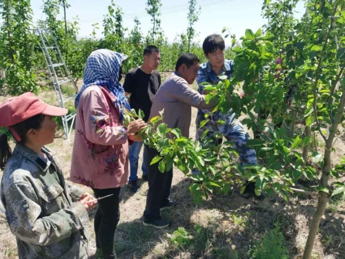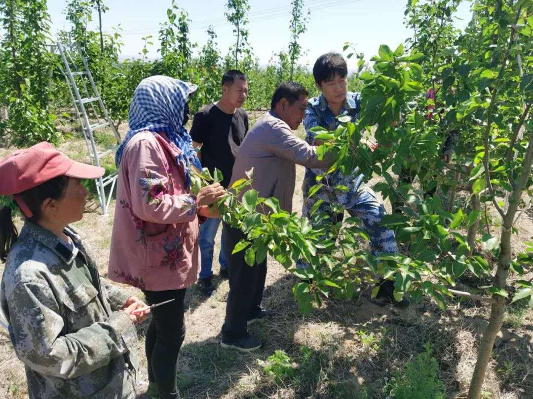 王躍(右一)指(zhi)導村集體經濟果(guo)園工人稀果(guo)