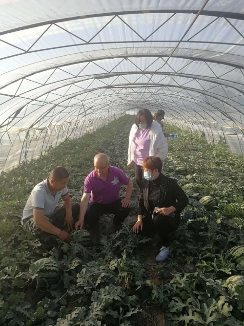 原秀樓(前(qian)中)指(zhi)導村民(min)大棚西瓜管理