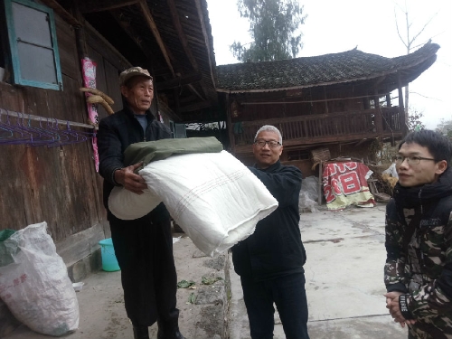 朱利慶(qing)為搬遷新(xin)(xin)家的建檔立卡貧困戶送上(shang)新(xin)(xin)被子和祝(zhu)福
