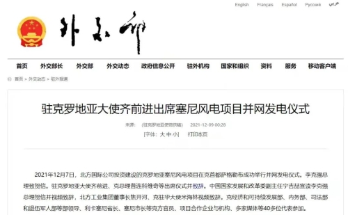 2021年12月7日,中(zhong)(zhong)國(guo)兵(bing)器工業(ye)集(ji)團(tuan)有限公司北(bei)(bei)方公司所屬北(bei)(bei)方國(guo)際投資、建(jian)設和(he)運(yun)營(ying)的塞尼(ni)156MW風電項目在(zai)克(ke)(ke)羅地亞首都薩格勒(le)布隆重舉行并(bing)網(wang)發電儀(yi)(yi)式。李克(ke)(ke)強總理(li)致(zhi)賀(he)信(xin)。克(ke)(ke)羅地亞總理(li)安(an)德(de)烈·普連(lian)科維奇(qi),中(zhong)(zhong)國(guo)駐(zhu)克(ke)(ke)羅地亞大(da)使齊前(qian)進出席儀(yi)(yi)式并(bing)致(zhi)辭(ci)。中(zhong)(zhong)國(guo)國(guo)家發展和(he)改革(ge)委員會副主任寧吉喆(zhe)宣(xuan)讀李克(ke)(ke)強總理(li)賀(he)信(xin)并(bing)視頻致(zhi)辭(ci),中(zhong)(zhong)國(guo)兵(bing)器工業(ye)集(ji)團(tuan)有限公司董事長(chang)焦開(kai)河(he)、克(ke)(ke)駐(zhu)華(hua)大(da)使米海(hai)林視頻致(zhi)辭(ci)。 中華人民共和國外交部報道 普連科維奇總理在(zai)致辭中(zhong)表(biao)示,感謝(xie)李克(ke)強總理發來(lai)賀(he)信,他與(yu)中(zhong)國領導(dao)人一(yi)直非常重視塞尼(ni)風(feng)電(dian)項(xiang)目(mu)投(tou)資與(yu)建設。祝賀(he)項(xiang)目(mu)克(ke)服疫情與(yu)地(di)震(zhen)等(deng)影響,成(cheng)(cheng)功并網發電(dian)。增加(jia)(jia)清潔可(ke)再生能(neng)源(yuan)、綠色電(dian)力對克(ke)乃(nai)至歐洲都很重要,克(ke)政府(fu)的重要戰略(lve)和目(mu)標之一(yi)就是低碳發展和增加(jia)(jia)清潔能(neng)源(yuan)供應。塞尼(ni)風(feng)電(dian)項(xiang)目(mu)占(zhan)克(ke)總發電(dian)量(liang)將達3.5%,對克(ke)實現(xian)2022年可(ke)再生能(neng)源(yuan)比例30%目(mu)標具有(you)很大幫助。此次(ci)投(tou)資使(shi)北方國際成(cheng)(cheng)為在(zai)克(ke)最大的清潔能(neng)源(yuan)投(tou)資企(qi)業(ye)。非常歡迎更多中(zhong)國企(qi)業(ye)擴大對克(ke)投(tou)資。 寧吉(ji)喆宣讀李克強總理(li)(li)賀信并視頻致辭時表示,2017年11月(yue)第(di)六次中(zhong)(zhong)(zhong)國(guo)(guo)—中(zhong)(zhong)(zhong)東歐國(guo)(guo)家領(ling)導(dao)人(ren)會晤(wu)期間(jian),在李克強總理(li)(li)和普連科維奇(qi)總理(li)(li)等(deng)中(zhong)(zhong)(zhong)東歐16國(guo)(guo)領(ling)導(dao)人(ren)的(de)共同見證下,塞尼項目簽(qian)署了協議。項目既是中(zhong)(zhong)(zhong)國(guo)(guo)堅定踐行綠色發展(zhan)理(li)(li)念的(de)具體體現,也是中(zhong)(zhong)(zhong)國(guo)(guo)深(shen)化與克羅地亞、與中(zhong)(zhong)(zhong)東歐國(guo)(guo)家務(wu)實合(he)作(zuo)的(de)生動(dong)實踐。希望中(zhong)(zhong)(zhong)克兩(liang)(liang)國(guo)(guo)政府部門,企業等(deng)有關各方共同努力、相(xiang)互配合(he),運營好塞尼項目,打(da)造出中(zhong)(zhong)(zhong)歐綠色合(he)作(zuo)的(de)樣(yang)板,帶動(dong)兩(liang)(liang)國(guo)(guo)務(wu)實合(he)作(zuo)持續深(shen)入發展(zhan),造福兩(liang)(liang)國(guo)(guo)人(ren)民。 焦開河在(zai)致(zhi)辭時表示(shi),在(zai)塞(sai)尼項目(mu)投入(ru)(ru)運營之際,李克(ke)強(qiang)總(zong)理(li)(li)專(zhuan)門致(zhi)信祝賀。作為塞(sai)尼項目(mu)的投資方(fang)、建設方(fang)、運營方(fang),我們備受鼓舞,深(shen)(shen)感自豪!未來,中(zhong)國兵器工業集團有(you)限公(gong)司將繼(ji)續深(shen)(shen)入(ru)(ru)貫徹落實習近平(ping)總(zong)書記重要指示(shi)批示(shi)精(jing)神和李克(ke)強(qiang)總(zong)理(li)(li)賀信重要要求,以(yi)高標準、可持續、惠民生為目(mu)標,與(yu)克(ke)方(fang)合作伙伴(ban)坦誠(cheng)溝通(tong)、攜手并進(jin),進(jin)一步(bu)推(tui)動(dong)綠色能(neng)源建設,努力(li)打造(zao)更多(duo)的“一帶一路”標志性(xing)、引領性(xing)、示(shi)范性(xing)項目(mu),為鞏固中(zhong)克(ke)戰(zhan)略(lve)合作伙伴(ban)關系、推(tui)進(jin)中(zhong)克(ke)從(cong)經貿領域(yu)到全方(fang)位合作貢獻積極力(li)量。