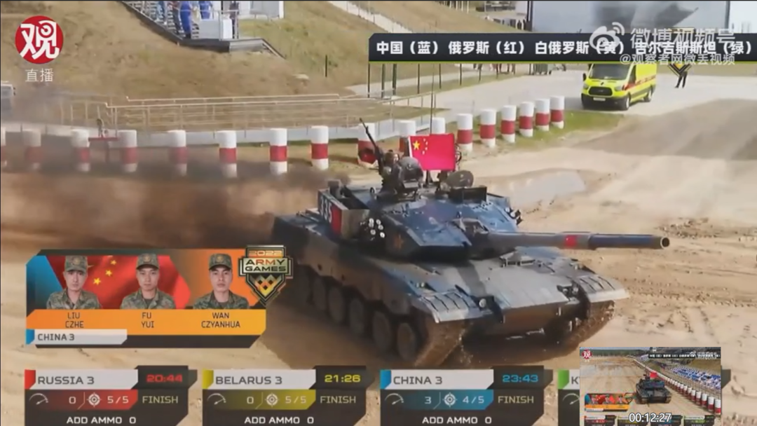 96B坦克助力中國隊挺進“坦克兩項”半決賽 當地時間8月21日 “國際軍(jun)事(shi)比賽-2022” “坦克兩項”單車賽第三輪的比拼 在俄(e)羅斯阿拉(la)比(bi)諾拉(la)開帷幕 中國參賽隊駕駛96B坦克 發揮出色 在單車賽中 中國(guo)與(yu)白俄羅(luo)(luo)斯(si)(si)、俄羅(luo)(luo)斯(si)(si)、吉爾吉斯(si)(si)斯(si)(si)坦 分在同一組進行比拼 比賽中 96B坦克全(quan)程(cheng)發(fa)揮(hui)穩定 一路疾馳通過 涉(she)水場(chang)、土嶺、車轍橋(qiao)等(deng)各類障礙 順利完成比賽 高射機槍命中 本屆“國(guo)際軍事比賽”“坦克兩(liang)項”項目 共有21個國家和地區的隊伍參加 中國參賽隊 335車組、334車組、336車組 分別取(qu)得第五、第八、第九名 以單車賽總(zong)評(ping)第(di)二的成績(ji) 成功晉級半決賽