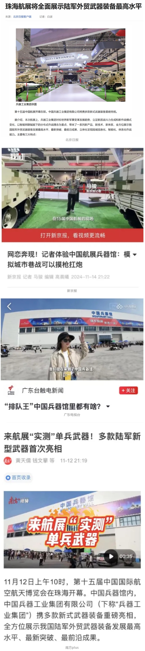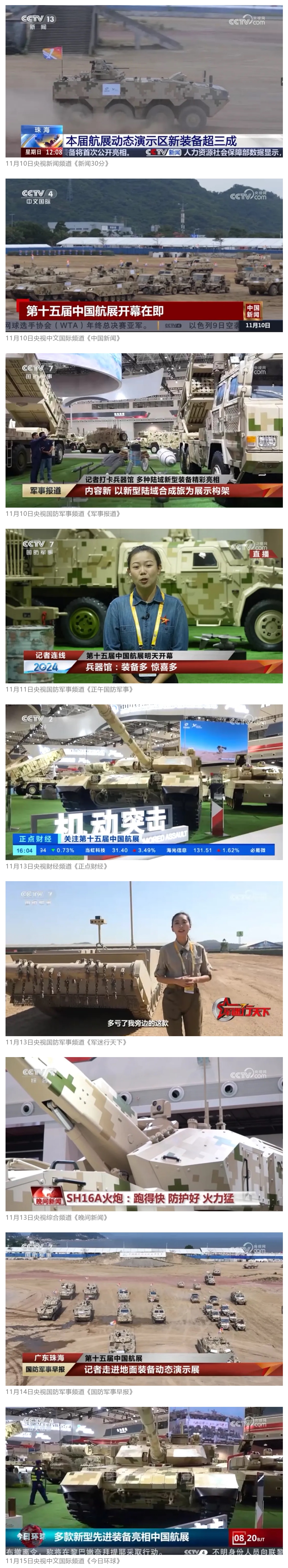 11月(yue)(yue)13日(ri)(ri)(ri)央(yang)視(shi)(shi)(shi)(shi)新聞(wen)(wen)《藍天(tian)之約》直(zhi)(zhi)播(bo)地面裝備(bei)動態演示此次航展,央(yang)視(shi)(shi)(shi)(shi)綜合頻(pin)道(dao)(dao)(dao)《新聞(wen)(wen)聯(lian)播(bo)》《晚間新聞(wen)(wen)》、新聞(wen)(wen)頻(pin)道(dao)(dao)(dao)《新聞(wen)(wen)直(zhi)(zhi)播(bo)間》《新聞(wen)(wen)30分》《朝聞(wen)(wen)天(tian)下(xia)》《共同關(guan)注》《東方時(shi)空》《午(wu)夜新聞(wen)(wen)》、財(cai)經頻(pin)道(dao)(dao)(dao)《天(tian)下(xia)財(cai)經》《經濟信息聯(lian)播(bo)》《正點財(cai)經》《第(di)一(yi)時(shi)間》、中(zhong)(zhong)文國(guo)際頻(pin)道(dao)(dao)(dao)《今日(ri)(ri)(ri)環(huan)球》《中(zhong)(zhong)國(guo)新聞(wen)(wen)》、國(guo)防軍(jun)(jun)(jun)事(shi)頻(pin)道(dao)(dao)(dao)《軍(jun)(jun)(jun)事(shi)報道(dao)(dao)(dao)》《正午(wu)國(guo)防軍(jun)(jun)(jun)事(shi)》《國(guo)防軍(jun)(jun)(jun)事(shi)早報》《軍(jun)(jun)(jun)迷行天(tian)下(xia)》等欄目共播(bo)出兵(bing)器工(gong)業集團參(can)展相關(guan)新聞(wen)(wen)報道(dao)(dao)(dao)40余(yu)條(tiao)。11月(yue)(yue)10日(ri)(ri)(ri)央(yang)視(shi)(shi)(shi)(shi)新聞(wen)(wen)頻(pin)道(dao)(dao)(dao)《新聞(wen)(wen)30分》11月(yue)(yue)10日(ri)(ri)(ri)央(yang)視(shi)(shi)(shi)(shi)中(zhong)(zhong)文國(guo)際頻(pin)道(dao)(dao)(dao)《中(zhong)(zhong)國(guo)新聞(wen)(wen)》11月(yue)(yue)10日(ri)(ri)(ri)央(yang)視(shi)(shi)(shi)(shi)國(guo)防軍(jun)(jun)(jun)事(shi)頻(pin)道(dao)(dao)(dao)《軍(jun)(jun)(jun)事(shi)報道(dao)(dao)(dao)》11月(yue)(yue)11日(ri)(ri)(ri)央(yang)視(shi)(shi)(shi)(shi)國(guo)防軍(jun)(jun)(jun)事(shi)頻(pin)道(dao)(dao)(dao)《正午(wu)國(guo)防軍(jun)(jun)(jun)事(shi)》