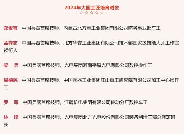日(ri)前,中華全(quan)國(guo)(guo)(guo)總工會(hui)印(yin)發《關(guan)于公布(bu)2024年大(da)國(guo)(guo)(guo)工匠(jiang)培(pei)育對(dui)(dui)象并(bing)開展(zhan)大(da)國(guo)(guo)(guo)工匠(jiang)培(pei)育工作的通知》,公布(bu)入選(xuan)2024年大(da)國(guo)(guo)(guo)工匠(jiang)培(pei)育對(dui)(dui)象名單。經推薦(jian)、形審(shen)、網(wang)審(shen)、會(hui)評(ping)、審(shen)定、公示等程序,共有220人被確定為2024年大(da)國(guo)(guo)(guo)工匠(jiang)培(pei)育對(dui)(dui)象,中國(guo)(guo)(guo)兵器工業集(ji)團有限公司6名高(gao)技能人才入選(xuan)。