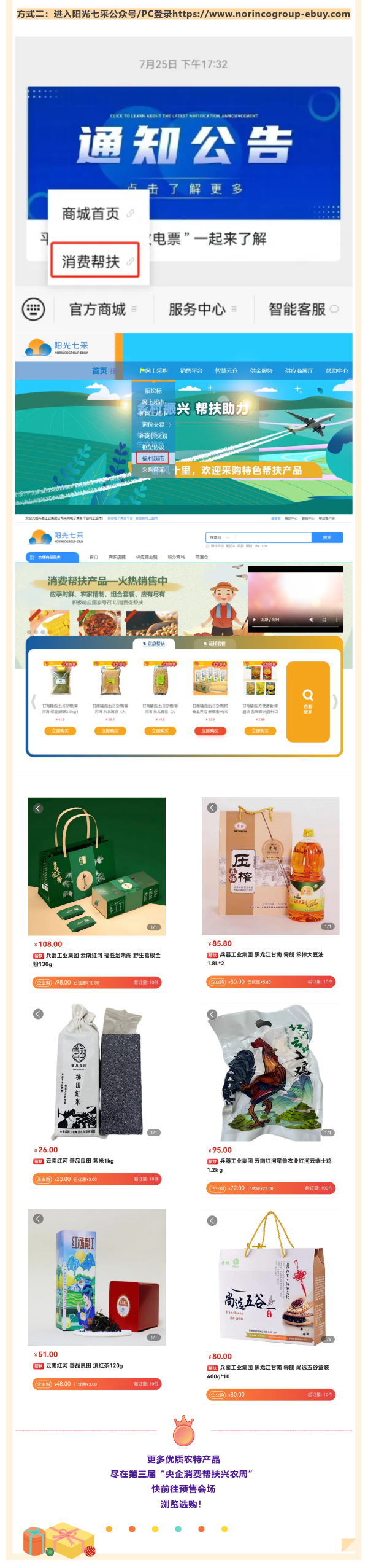 百家央企聚合力 消費幫扶促振興 第三屆“央企消費幫扶興農周” 預售已啟動 8月30日 興農周活動將正式開啟 “央企消費幫扶興農周”由國(guo)(guo)務(wu)院(yuan)國(guo)(guo)資(zi)委(wei)社會責任局指導(dao),央企(qi)消費(fei)幫扶電(dian)商(shang)平臺(國(guo)(guo)網數字科技控(kong)股有限公司)主辦(ban),國(guo)(guo)務(wu)院(yuan)國(guo)(guo)資(zi)委(wei)機(ji)關服務(wu)管理局、國(guo)(guo)務(wu)院(yuan)國(guo)(guo)資(zi)委(wei)新聞(wen)中(zhong)心、國(guo)(guo)網北(bei)京市電(dian)力公司、各中(zhong)央企(qi)業電(dian)商(shang)平臺聯合協辦(ban)。 活動以“央企攜手,興農惠民”為主題,組織動員中央企業所屬各單位各部門(特別是工會、食堂)、廣大干部職工、上下游供應商和業務合作伙伴采購幫扶縣的優質農產品,促進脫貧地區產業發展和脫貧群眾穩定增收,鞏固拓展脫貧攻堅成果。 預售活動火熱開啟 為方便大家提前選購 此次預售期升級為10天 (8月20日-8月29日) 誠邀下單 兵器工業集團定點幫扶 黑龍江甘南縣、云南紅河縣 農特產品! 8月30日-9月5日 請鎖定“央企館-兵器工業集團” 我們一起共譜鄉村振興新篇章! |