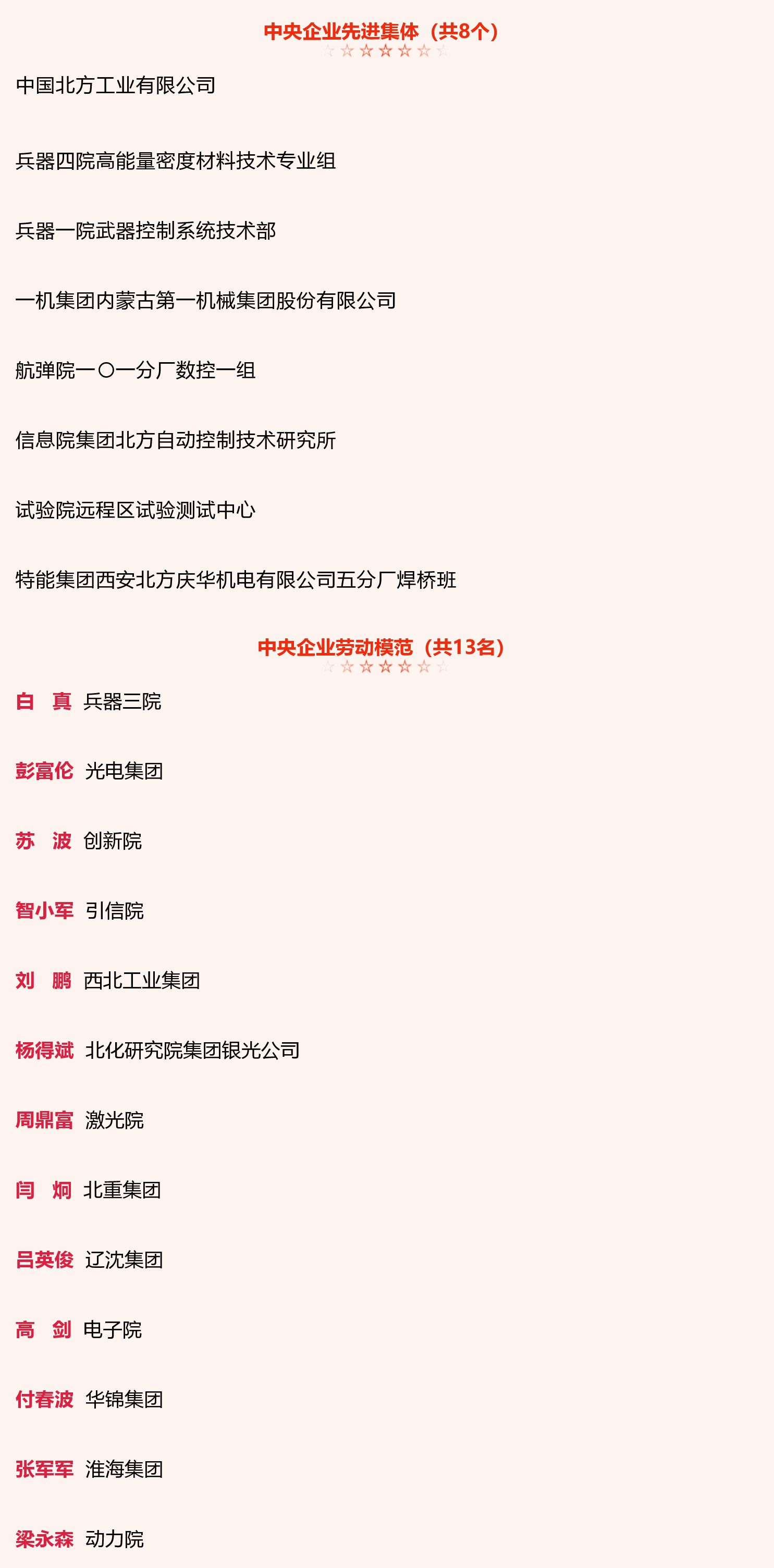 近日,人力資(zi)源社會保障部、國(guo)務院國(guo)資(zi)委發布(bu)《關(guan)于表彰中央企業先(xian)進(jin)集(ji)體(ti)和勞動模范的決(jue)定》并召(zhao)開(kai)表彰大(da)會,中國(guo)兵器工業集(ji)團有限公司8個集(ji)體(ti)榮獲“中央企業先(xian)進(jin)集(ji)體(ti)”稱號,13名個人榮獲“中央企業勞動模范”稱號。