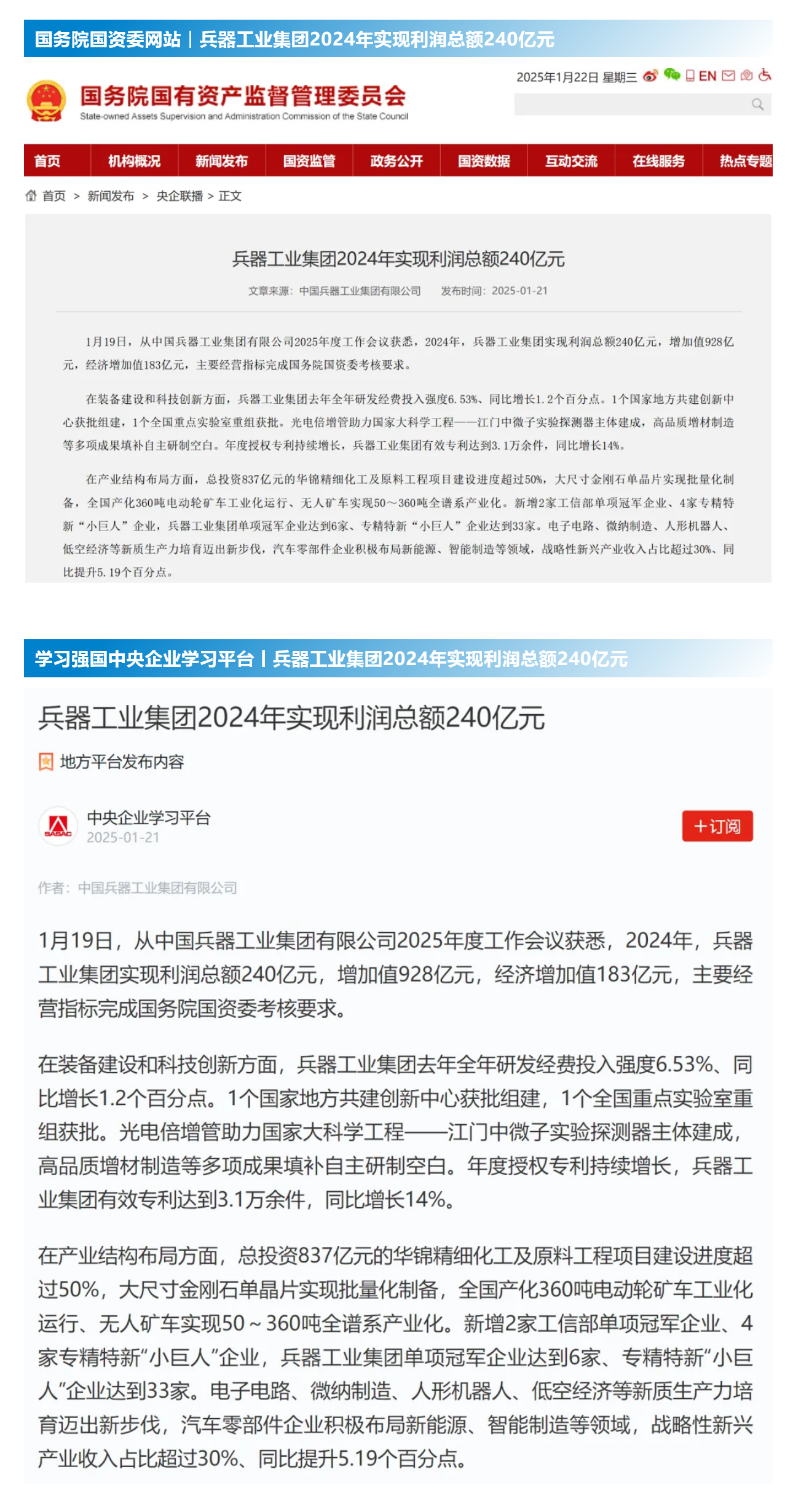 1月19日(ri)至20日(ri),中(zhong)國兵(bing)器工(gong)(gong)業集(ji)團有限公司(si)2025年(nian)度(du)工(gong)(gong)作(zuo)會(hui)議(yi)在京召開,會(hui)議(yi)總(zong)結2024年(nian)工(gong)(gong)作(zuo),分(fen)析形勢任務,明確工(gong)(gong)作(zuo)思路,部署(shu)2025年(nian)工(gong)(gong)作(zuo)。 集團(tuan)公(gong)(gong)(gong)司(si)2024年(nian)取(qu)得的(de)(de)成績及(ji)下一步(bu)重點工作(zuo)(zuo)受到社會媒(mei)體(ti)(ti)(ti)(ti)廣泛關(guan)注(zhu)。新(xin)(xin)(xin)華(hua)社、中(zhong)(zhong)國(guo)(guo)(guo)新(xin)(xin)(xin)聞網(wang)(wang)(wang)、中(zhong)(zhong)國(guo)(guo)(guo)科(ke)(ke)技(ji)網(wang)(wang)(wang)、光(guang)明(ming)(ming)日(ri)報(bao)(bao)(bao)客(ke)(ke)戶(hu)(hu)端、經(jing)濟日(ri)報(bao)(bao)(bao)客(ke)(ke)戶(hu)(hu)端、中(zhong)(zhong)國(guo)(guo)(guo)日(ri)報(bao)(bao)(bao)網(wang)(wang)(wang)、國(guo)(guo)(guo)務院國(guo)(guo)(guo)資委網(wang)(wang)(wang)站、學(xue)習強國(guo)(guo)(guo)中(zhong)(zhong)央企業(ye)學(xue)習平(ping)臺(tai)、新(xin)(xin)(xin)浪網(wang)(wang)(wang)、網(wang)(wang)(wang)易網(wang)(wang)(wang)、搜狐網(wang)(wang)(wang)、騰(teng)訊網(wang)(wang)(wang)、鳳凰網(wang)(wang)(wang)等(deng)中(zhong)(zhong)央主流(liu)媒(mei)體(ti)(ti)(ti)(ti)、國(guo)(guo)(guo)家(jia)部委網(wang)(wang)(wang)站及(ji)知名(ming)網(wang)(wang)(wang)絡媒(mei)體(ti)(ti)(ti)(ti)對集團(tuan)公(gong)(gong)(gong)司(si)2025年(nian)度工作(zuo)(zuo)會議進(jin)行(xing)了(le)(le)報(bao)(bao)(bao)道,重點關(guan)注(zhu)集團(tuan)公(gong)(gong)(gong)司(si)經(jing)營(ying)業(ye)績、科(ke)(ke)技(ji)創新(xin)(xin)(xin)、產業(ye)結(jie)構布(bu)(bu)局優化等(deng)情況。其中(zhong)(zhong),新(xin)(xin)(xin)華(hua)社以《我(wo)國(guo)(guo)(guo)實現50至360噸無(wu)人(ren)礦車全譜系產業(ye)化》為題,重點報(bao)(bao)(bao)道了(le)(le)集團(tuan)公(gong)(gong)(gong)司(si)在推動智能制造水平(ping)提升方面取(qu)得的(de)(de)成效(xiao);中(zhong)(zhong)國(guo)(guo)(guo)新(xin)(xin)(xin)聞網(wang)(wang)(wang)、光(guang)明(ming)(ming)日(ri)報(bao)(bao)(bao)客(ke)(ke)戶(hu)(hu)端、經(jing)濟日(ri)報(bao)(bao)(bao)客(ke)(ke)戶(hu)(hu)端、中(zhong)(zhong)國(guo)(guo)(guo)日(ri)報(bao)(bao)(bao)網(wang)(wang)(wang)等(deng)就集團(tuan)公(gong)(gong)(gong)司(si)2024年(nian)度經(jing)營(ying)業(ye)績及(ji)各項工作(zuo)(zuo)取(qu)得的(de)(de)成果(guo)進(jin)行(xing)報(bao)(bao)(bao)道;中(zhong)(zhong)國(guo)(guo)(guo)科(ke)(ke)技(ji)網(wang)(wang)(wang)著重報(bao)(bao)(bao)道了(le)(le)集團(tuan)公(gong)(gong)(gong)司(si)在科(ke)(ke)技(ji)創新(xin)(xin)(xin)和(he)優化產業(ye)結(jie)構布(bu)(bu)局方面的(de)(de)最新(xin)(xin)(xin)進(jin)展(zhan)。集團(tuan)公(gong)(gong)(gong)司(si)門戶(hu)(hu)網(wang)(wang)(wang)站、微(wei)信公(gong)(gong)(gong)眾號、微(wei)博等(deng)新(xin)(xin)(xin)媒(mei)體(ti)(ti)(ti)(ti)平(ping)臺(tai)以及(ji)《中(zhong)(zhong)國(guo)(guo)(guo)兵工報(bao)(bao)(bao)》也對集團(tuan)公(gong)(gong)(gong)司(si)工作(zuo)(zuo)會議進(jin)行(xing)了(le)(le)及(ji)時報(bao)(bao)(bao)道,各成員(yuan)單位紛紛對相關(guan)內容進(jin)行(xing)轉載,引(yin)發全系統關(guan)注(zhu)。 集團公司職工及廣大網友熱議工作會 “2025年工作會為我們指(zhi)明了發展方向、明確(que)了奮斗目標,面(mian)對全新的機(ji)遇和(he)挑戰(zhan),作為兵工人深感(gan)責(ze)任(ren)重大(da)。” “科技是(shi)第一生產力(li),一定要以科技創新(xin)引(yin)領新(xin)質生產力(li)發(fa)展,為高(gao)質量發(fa)展提供支撐。” “把各項工作做深、做實、做細,努力為集團公司高質量發(fa)展添(tian)磚加(jia)瓦。” “2024年(nian)中國(guo)兵器展示了大國(guo)重器,祝新的一(yi)年(nian)中再創(chuang)輝煌!” |