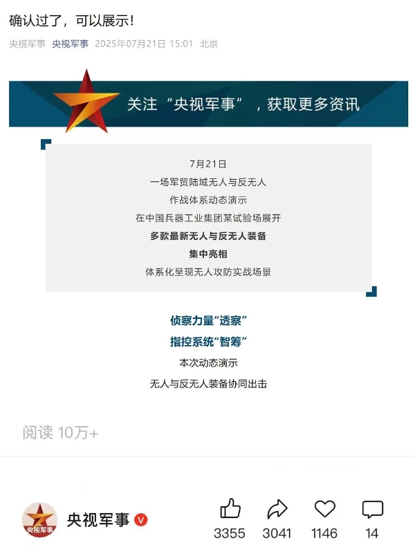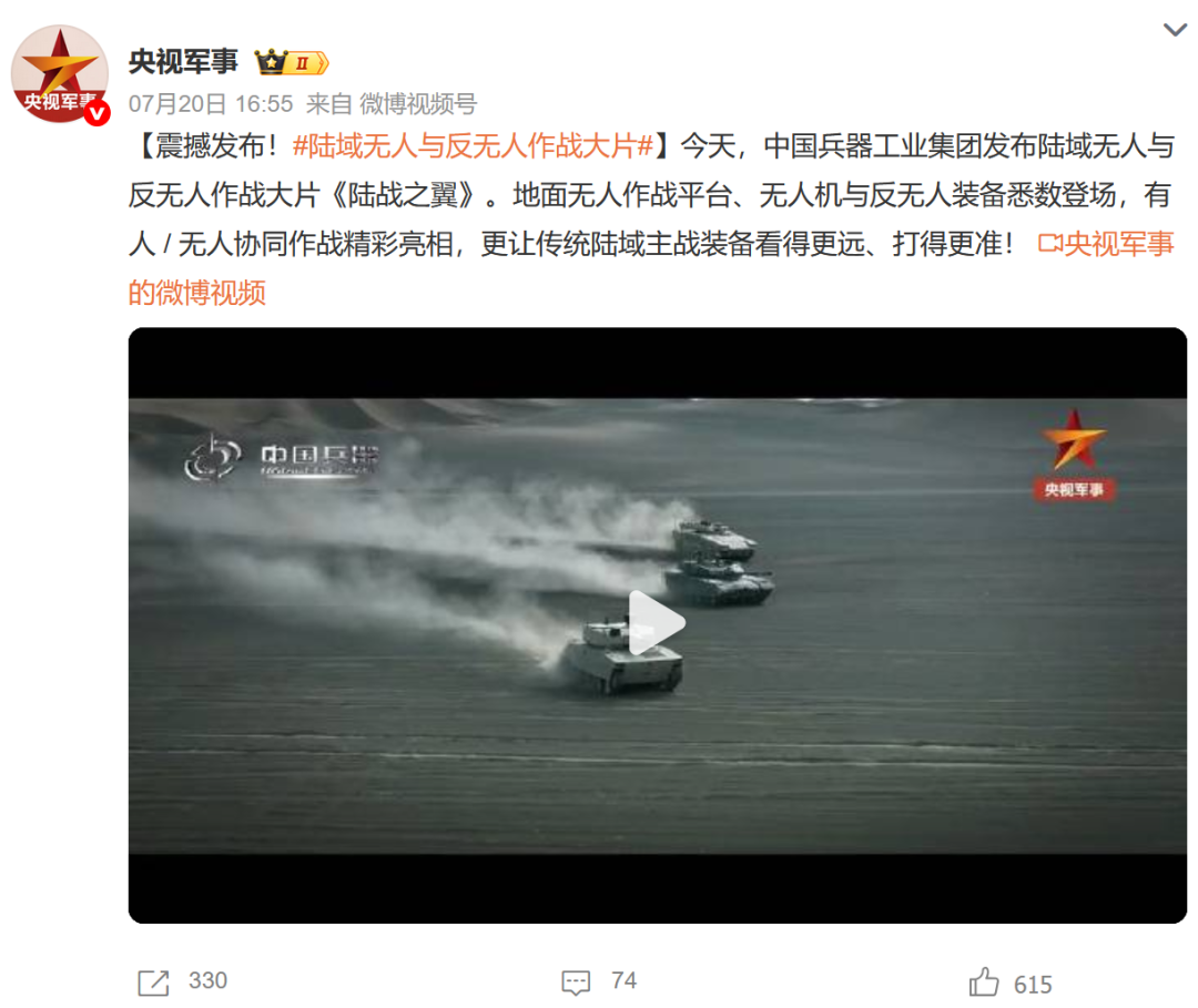 7月(yue)21日(ri),中(zhong)(zhong)國兵(bing)器工業集團有限公司在位于內蒙古的某試(shi)驗場(chang)舉辦軍(jun)貿(mao)陸域無(wu)(wu)人與反無(wu)(wu)人作戰體系主(zhu)題日(ri)活動,攜(xie)無(wu)(wu)人機、巡(xun)飛彈、反無(wu)(wu)人機等最新武(wu)器裝備登場(chang)亮相(xiang),展現了一場(chang)無(wu)(wu)人與反無(wu)(wu)人領域激烈對抗的實戰場(chang)景(jing)。中(zhong)(zhong)央主(zhu)流媒(mei)體、地方媒(mei)體、知名網絡媒(mei)體,以及(ji)集團公司各宣傳平臺紛紛進行報道,多(duo)次登上熱搜,引發廣泛關注。 央視新聞頻道(dao)《新聞直(zhi)播間》《東方時(shi)(shi)空》《24小時(shi)(shi)》、國(guo)(guo)(guo)防軍事(shi)頻道(dao)《正午國(guo)(guo)(guo)防軍事(shi)》《軍事(shi)報道(dao)》《國(guo)(guo)(guo)防軍事(shi)早報》、中文國(guo)(guo)(guo)際頻道(dao)《今日環球》、央視軍事(shi)新媒體(ti)等報道(dao)了(le)集團公(gong)司(si)軍貿陸(lu)域無人與(yu)反無人作戰(zhan)體(ti)系首次(ci)公(gong)開實裝動態(tai)演示有關情(qing)況,重點介紹了(le)無人與(yu)反無人作戰(zhan)最新裝備。 央視新聞頻道(dao)《新聞直播(bo)間》:內蒙古 軍貿(mao)陸(lu)域無人(ren)與反無人(ren)作戰(zhan)最(zui)新裝備亮相(xiang) 央視(shi)新聞頻道(dao)《新聞直(zhi)播間》:內蒙古 軍貿陸域無(wu)人(ren)(ren)與(yu)反無(wu)人(ren)(ren)作戰最(zui)新裝備(bei)亮相 記(ji)者探訪無(wu)人(ren)(ren)裝備(bei)展區 央視(shi)新(xin)聞(wen)頻道《新(xin)聞(wen)直播間》:軍貿(mao)陸域無人與(yu)反(fan)無人作戰最(zui)新(xin)裝備亮(liang)相·記者探訪 最(zui)強“盾牌” 反(fan)無人機(ji)系(xi)統新(xin)升級 人民日(ri)報(bao)微(wei)(wei)(wei)博(bo)(bo)(bo)、央(yang)視(shi)軍(jun)(jun)事(shi)微(wei)(wei)(wei)博(bo)(bo)(bo)、央(yang)視(shi)新(xin)(xin)聞客戶端、中國(guo)(guo)新(xin)(xin)聞網、中新(xin)(xin)社(she)國(guo)(guo)是直通車抖音(yin)、環球(qiu)網微(wei)(wei)(wei)博(bo)(bo)(bo)、環球(qiu)時報(bao)(X平臺(tai)、英文版客戶端)、中國(guo)(guo)日(ri)報(bao)網、央(yang)視(shi)軍(jun)(jun)事(shi)報(bao)道微(wei)(wei)(wei)博(bo)(bo)(bo)、中國(guo)(guo)軍(jun)(jun)號微(wei)(wei)(wei)博(bo)(bo)(bo)、中央(yang)廣播電視(shi)總臺(tai)“空天逐夢”微(wei)(wei)(wei)信視(shi)頻(pin)號、共(gong)青團(tuan)中央(yang)B站、國(guo)(guo)資小新(xin)(xin)微(wei)(wei)(wei)博(bo)(bo)(bo)等中央(yang)主流媒體、國(guo)(guo)家部委(wei)的新(xin)(xin)媒體播發集(ji)團(tuan)公司陸域無(wu)人與反無(wu)人作(zuo)戰大片等視(shi)頻(pin)作(zuo)品。 人民日報(bao)微博 央視(shi)軍(jun)事微博 人民(min)日(ri)(ri)報(bao)、新華網(wang)、央(yang)視(shi)軍(jun)事、央(yang)視(shi)新聞、中(zhong)央(yang)廣播電視(shi)總臺中(zhong)國(guo)(guo)之聲、中(zhong)國(guo)(guo)新聞網(wang)、中(zhong)國(guo)(guo)日(ri)(ri)報(bao)網(wang)、中(zhong)國(guo)(guo)日(ri)(ri)報(bao)英文報(bao)刊(kan)《CHINA DAILY》、《科技(ji)日(ri)(ri)報(bao)》、光明日(ri)(ri)報(bao)客戶端、環(huan)(huan)球網(wang)、環(huan)(huan)球時報(bao)、人民(min)日(ri)(ri)報(bao)海外版-海外網(wang)、央(yang)視(shi)網(wang)、小(xiao)央(yang)視(shi)頻(pin)、參考消息(xi)、瞭望東方(fang)周刊(kan)、共青(qing)團(tuan)中(zhong)央(yang)、國(guo)(guo)資小(xiao)新新媒體(ti)、新浪網(wang)、騰訊網(wang)、搜狐(hu)網(wang)、鳳(feng)凰網(wang)、網(wang)易網(wang)等中(zhong)央(yang)主流媒體(ti)、國(guo)(guo)家部委(wei)的新媒體(ti)及知名網(wang)絡(luo)媒體(ti)對集(ji)團(tuan)公(gong)司軍(jun)貿(mao)陸域(yu)無人與反無人作戰體(ti)系主題日(ri)(ri)活動進行(xing)了圖(tu)文、音(yin)頻(pin)、視(shi)頻(pin)報(bao)道。 央視(shi)軍(jun)事微信 人民日報微信 新華網(wang)微信 來源/各(ge)主流媒體 |